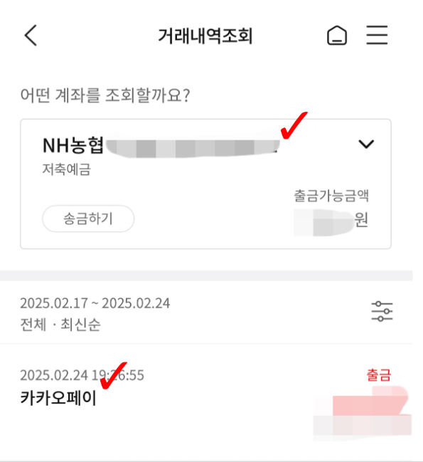 계좌번호와 카카오페이의 출금 내역을 함께 확인해주시면 좋아요😉